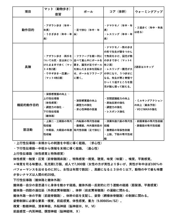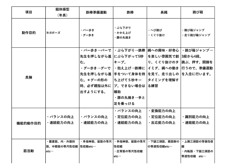 正課では運動会に向けた飛び箱、鉄棒、マット運動の体育指導をメインに、パフォーマンスを重視したコーディネーショントレーニングを組み合わせたプログラムを取り入れております。課外では、敏捷性、協調性、特異性などパフォーマンスを重視したプログラムを取り入れていきます。